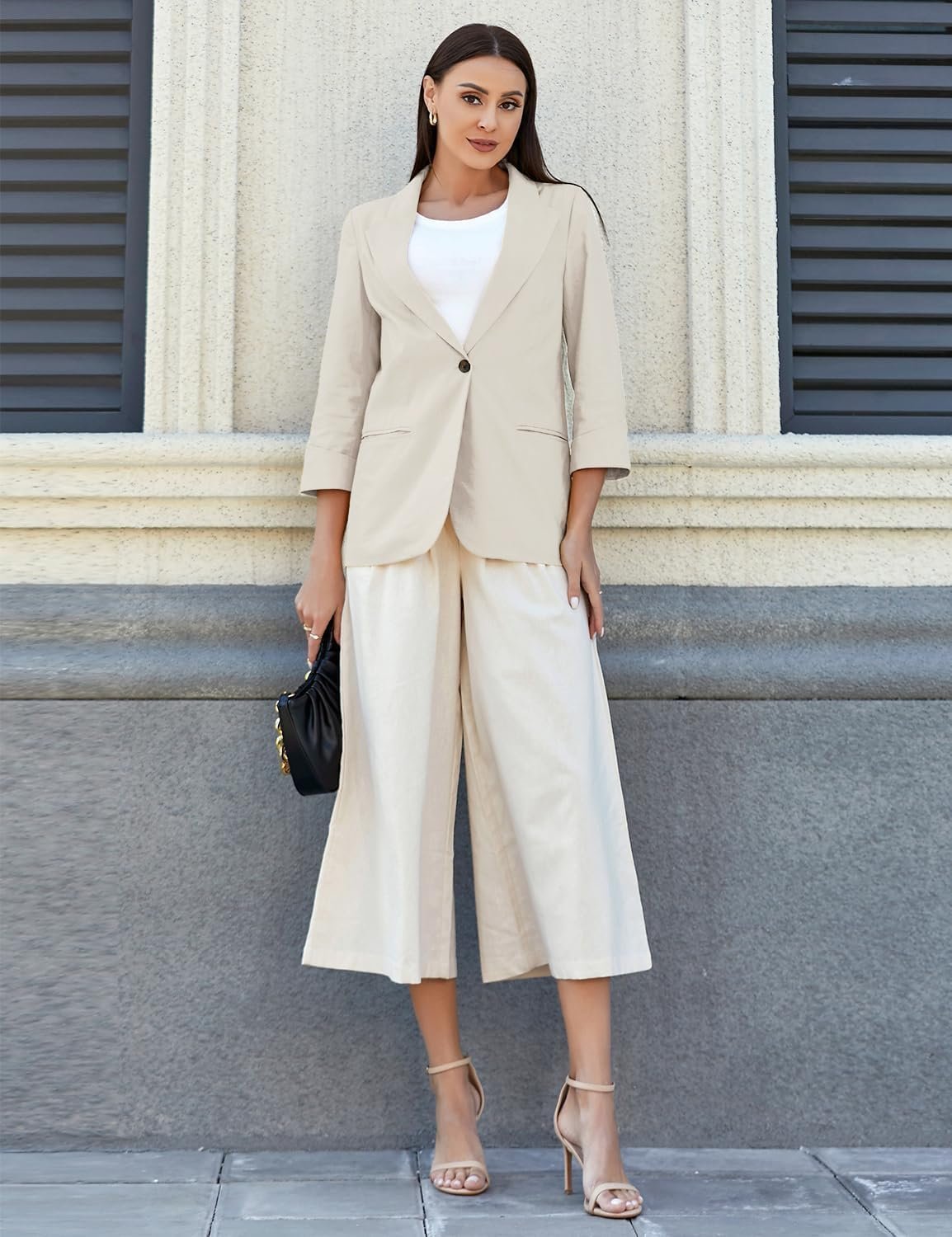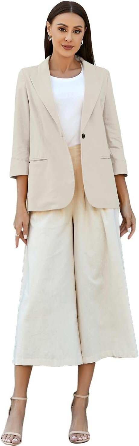 3/4 Sleeve Cotton Linen Blazer Jackets for Women One Button Notch Lapel Blazer