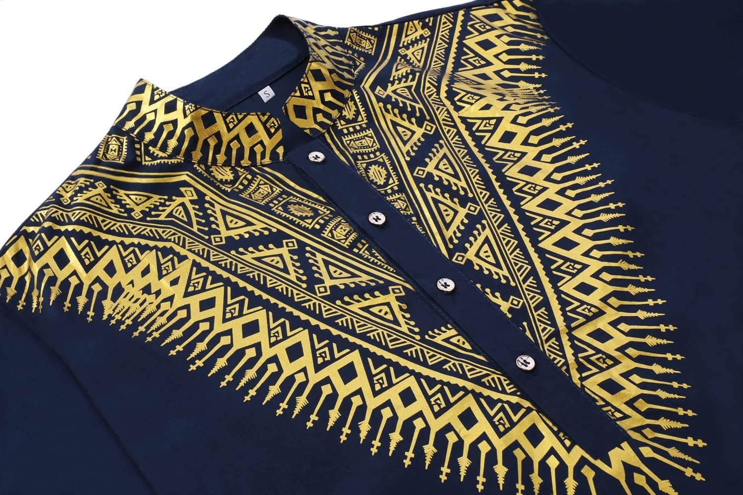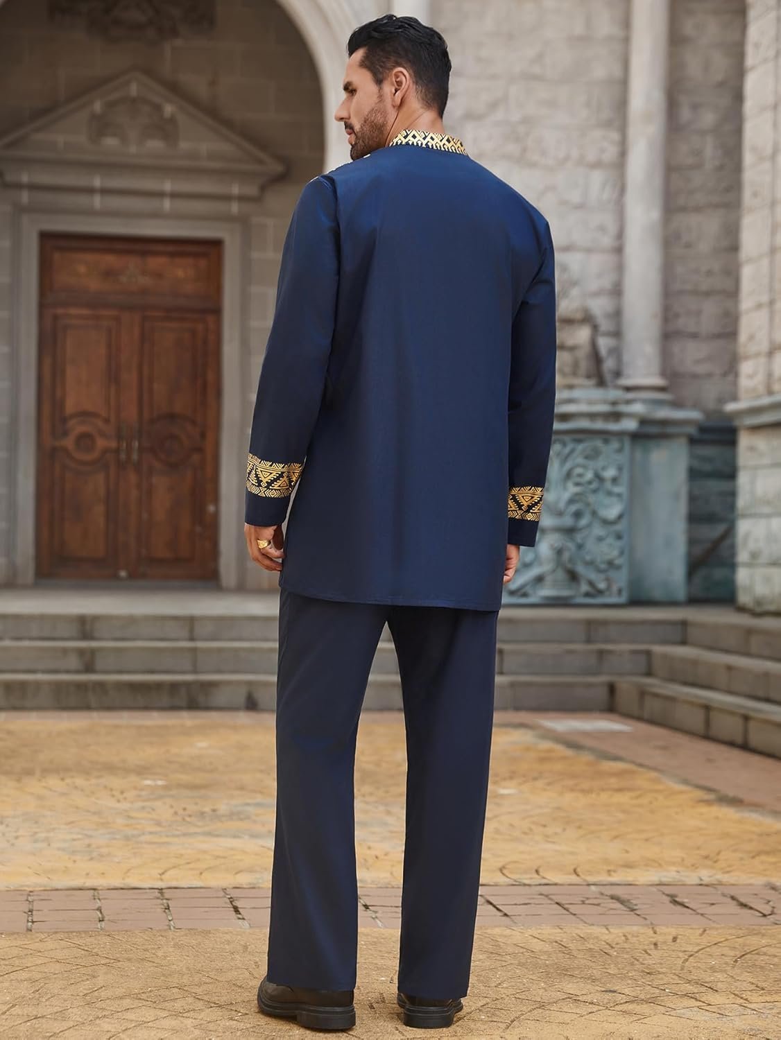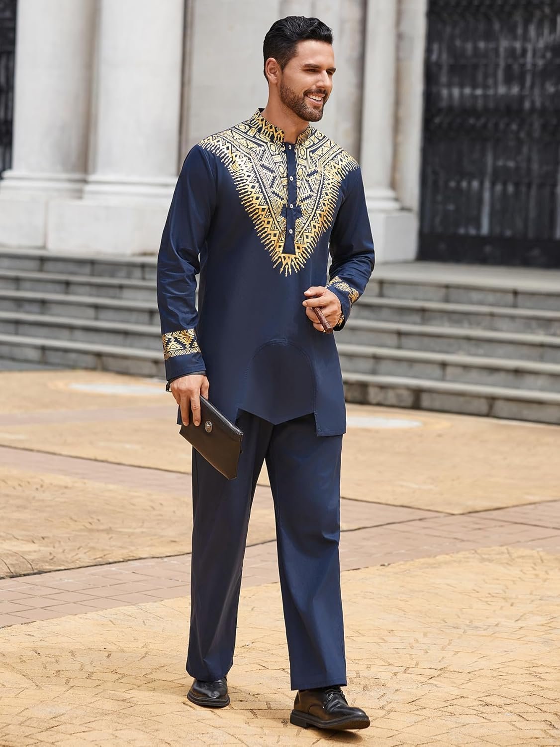 Pacinoble Mens African 2 Piece Set Metallic Traditional Suit Floral Printed Mens African Dashiki Shirt and Pants Outfit